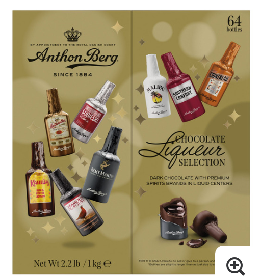 Dark Chocolate with Premium Spirits Brands in Liquid Centers. Flavors: Malibu, Kahlúa, Rémy Martin, Cointreau, The Famous Grouse, Southern Comfort, Sobieski, & Matusalem. 3.5% alcohol by volume.