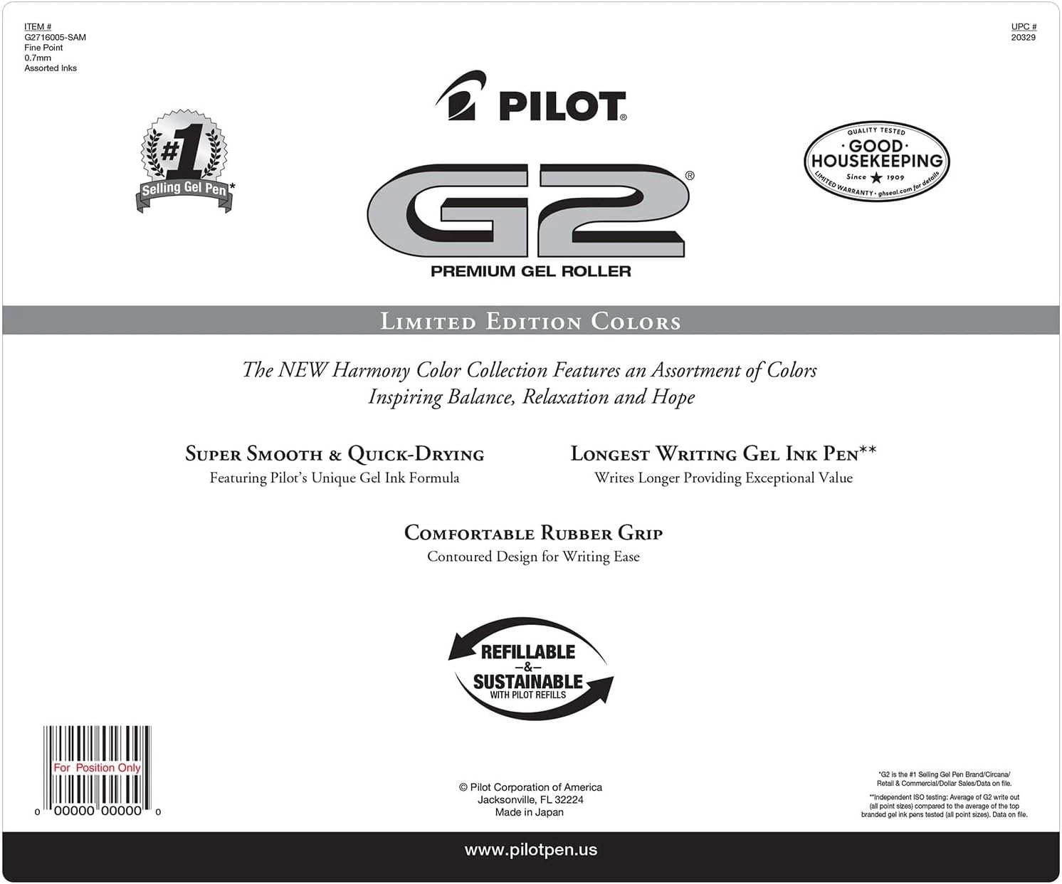 The colors in the Pilot Limited Edition G2 Harmony Collection were carefully selected and formulated to create an oasis of calm in the digital deluge that we all face every day. The G2 Harmony Collection colors include Gray, Yellow, Apricot Orange, Salmon, Grape and Rose Pink. The colors in this curated collection were developed to bring beautiful, smooth, effortless, colorful writing and balance and harmony to every writing task. Color psychology tells us that Gray represents neutrality and balance, Apricot Orange balances energy and is relaxing, Salmon pink signifies hope, health & happiness, Grape connotes harmony-the balance between opposing forces and Rose Pink brings grace, gratitude and joy. The (sunshine) Yellow signifies optimism and hope and even helps improve learning. There's just something about yellow that makes us think logically and positively. G2 continues to be the #1 selling pen and Gel pen in America by a wide margin, and these gorgeous new shades can be found in packs with other favorite, top-selling G2 colors. The quick-drying ink prevents smears and smudges, ensuring your work is neat and clear. Create masterpieces of writing or art with these smooth-flowing gel pens that deliver vivid and clear lines. We can all use more color and harmony in our daily lives, right?