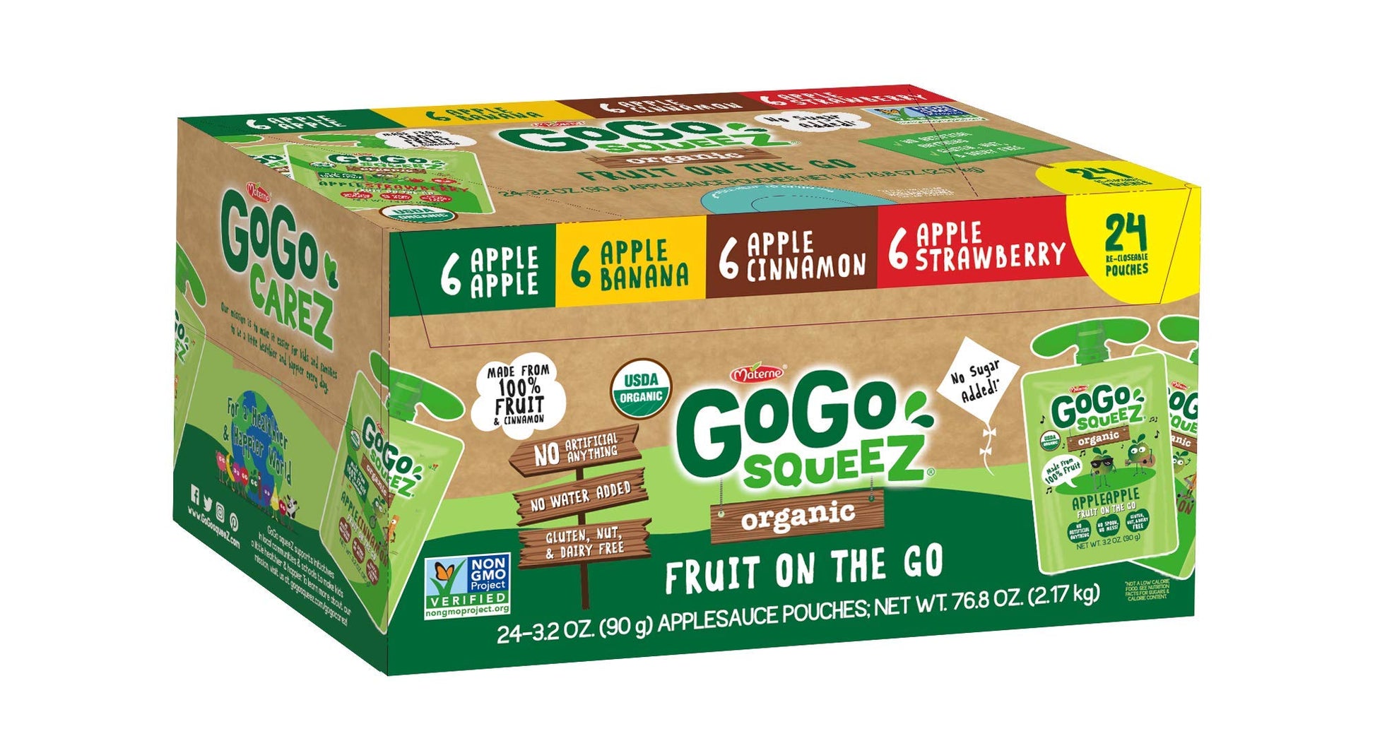 GoGo squeeZ Organic Variety Pack, (6) Apple Apple, (6) Apple Banana, (6) Apple Cinnamon and (6) Apple Strawberry applesauce snack pouches jammed packed with apples, bananas, cinnamon, strawberries and yumminess, for a tasty snack anytime, anywhere. An organic twist on the original, organic apple, banana, cinnamon and strawberry GoGo squeeZ are portable, delicious, organic applesauce snacks in a pouch. These unsweetened applesauce snacks are made from 100% fruit and cinnamon with no high fructose corn syrup (HFCS), no added colors or flavors and no sugar added.* All that lip-smacking fruit in a no-fuss, no-mess applesauce snack pouch! At GoGo squeeZ, we’re more than just applesauce pouches! We craft our products with high-quality ingredients to provide wholesome goodness for squeeZing and enjoying wherever life takes you. GoGo squeeZ unsweetened fruit snacks are Non-GMO Project Verified, gluten free, nut free, dairy free and Kosher Certified. Our products are free of common allergens, so you, your kids and the whole family can enjoy snacks from GoGo squeeZ with confidence and share without worry. Our pouches are BPA free and feature easy-open caps and a built-in straw. No spoon, and no mess! *Not a low calorie food. See nutrition facts for sugars and calorie content.