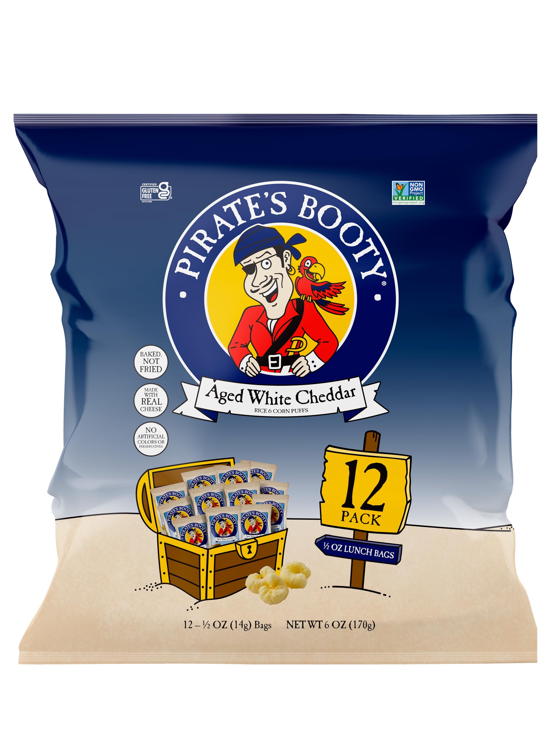 Pirate's Booty Aged White Cheddar Cheese Puffs contain 12 (0.5oz) snack-size bags. Perfect as lunch or afternoon snacks for kids