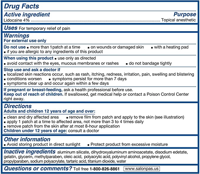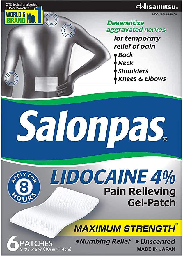 Salonpas Lidocaine Pain Relieving Gel- Patch provides temporary relief of pain associated with back, neck, shoulders, knees and elbows. Maximum strength available without a prescription, Desensitize aggravated nerves, and Numbing relief.