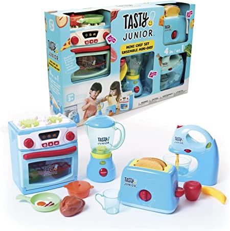 - Includes pretend foods- this fun set includes a mixer, blender, toaster, and oven along with fun and yummy food items such as roasted chicken, eggs and bacon, toast, apple, banana, as well as an accompanying frying pan, pot, and a mug.