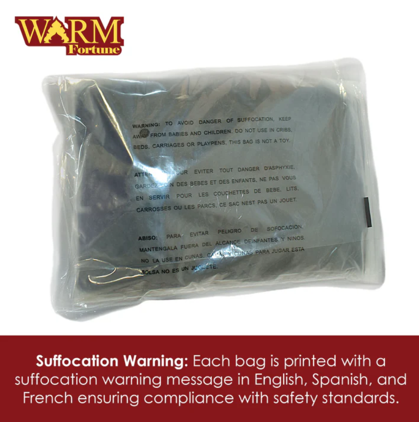 Suffocation Warning: Each bag is printed with a suffocation warning message in multiple languages, ensuring compliance with safety standards.
